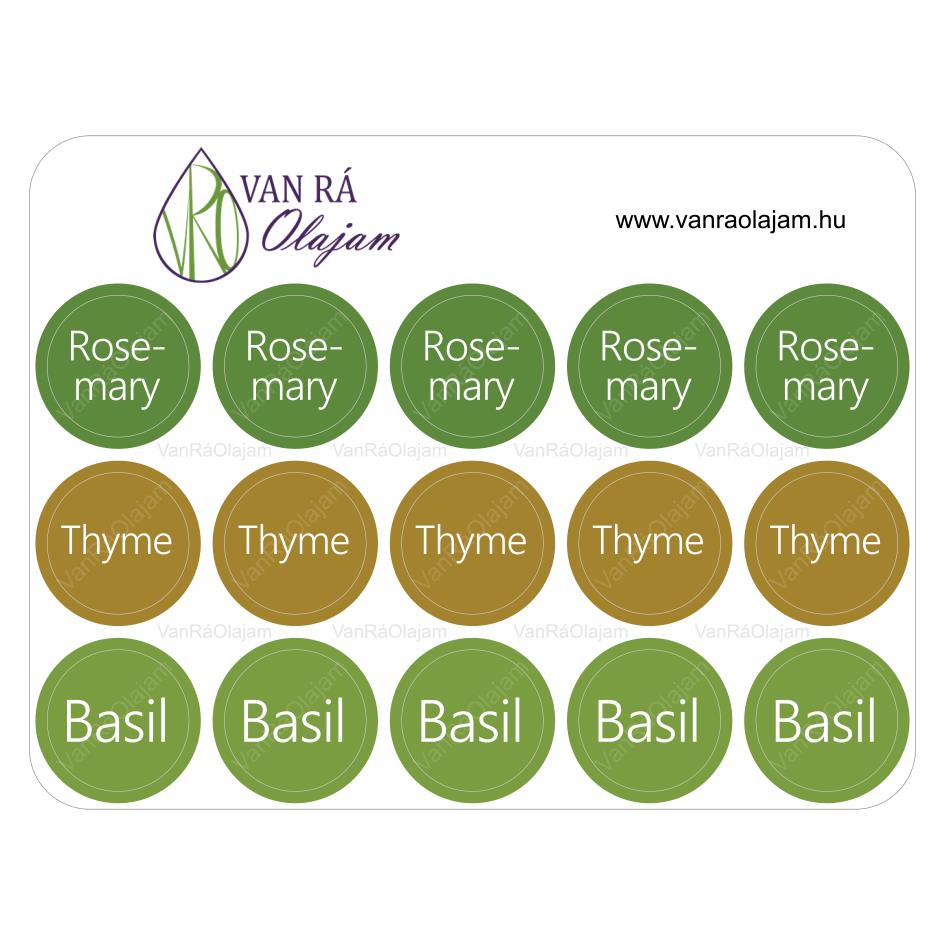 Élénk színű, matt bevonattal rendelkező olajálló Rosemary-Thyme-Basil kupak címke, mely később sem sötétedik be és nem válik el a felületről. Ez a 12 mm-es címke tökéletes megoldás az 5, 10, 15 ml-es üvegek illetve a minta üvegek kupakjának jelölésre, legyen szó gyári, mono olajról vagy egyedi keverékről.